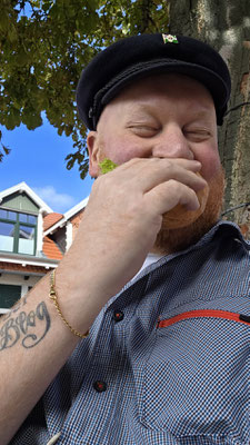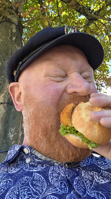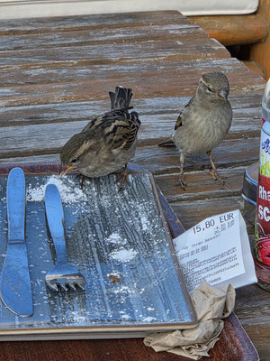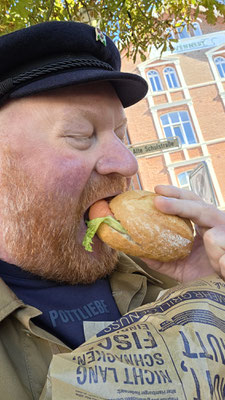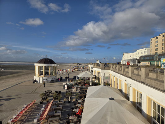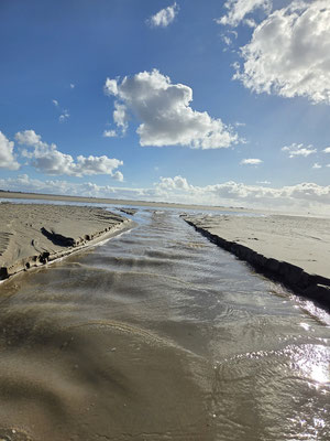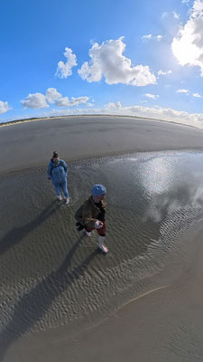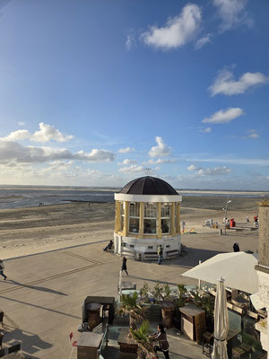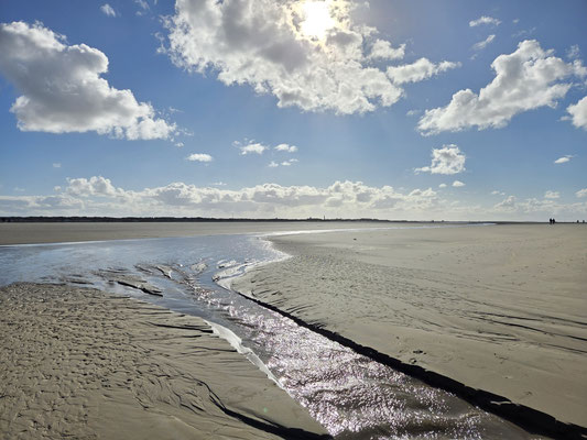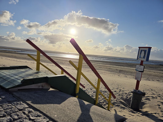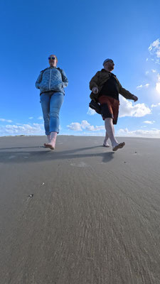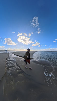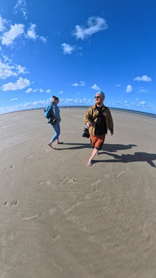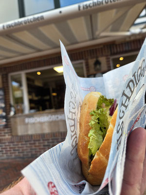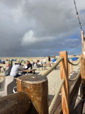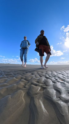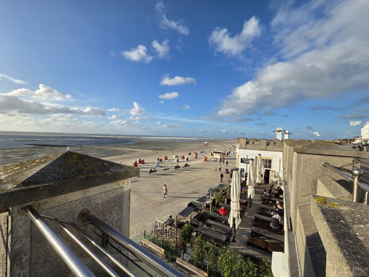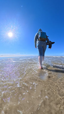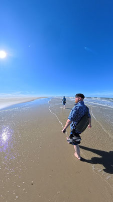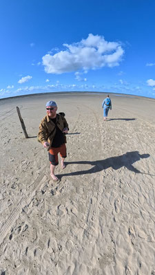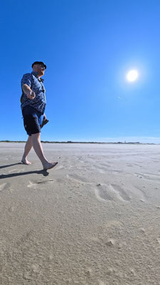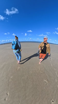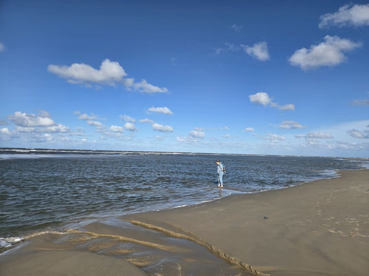 Von der Promenade aus ging es zum Café Sturmeck und weiter zur Wasserkante. Auf dem Rückweg zur Sandbank vor Borkum – Grenze zwischen Badestrand und Naturschutzgebiet – sorgte ein Ausrutscher im Schlick für unfreiwillige Unterhaltung. Der Schreck war mit zwei Fischfrikadellen schnell verdaut, bevor es zum Sonnenbad an den Südstrand ging.